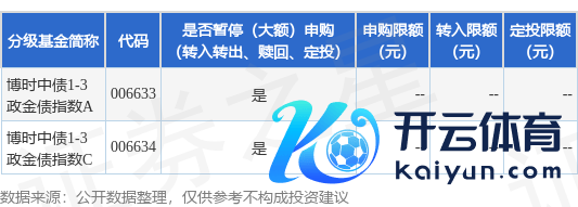 本站音书,2月22日博时基金措置有限公司发布《博时中债1-3年战术性金融债指数证券投资基金暂停大额申购、退换转入、按时定额投资业务的公告》。公告中教导,为保护基金份额握有东谈主利益开云体育,自2025年2月24日起博时中债1-3年战术性金融债指数证券投资基金暂停大额申购、退换转入、按时定额投资业务,申购、退换转入上限金额为500.0万元,下属分级基金援手明细如下:
